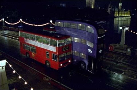 – Lambeth Bridge: El autobús noctámbulo tiene que pasar entre dos autobuses de dos pisos y tiene que estrecharse.